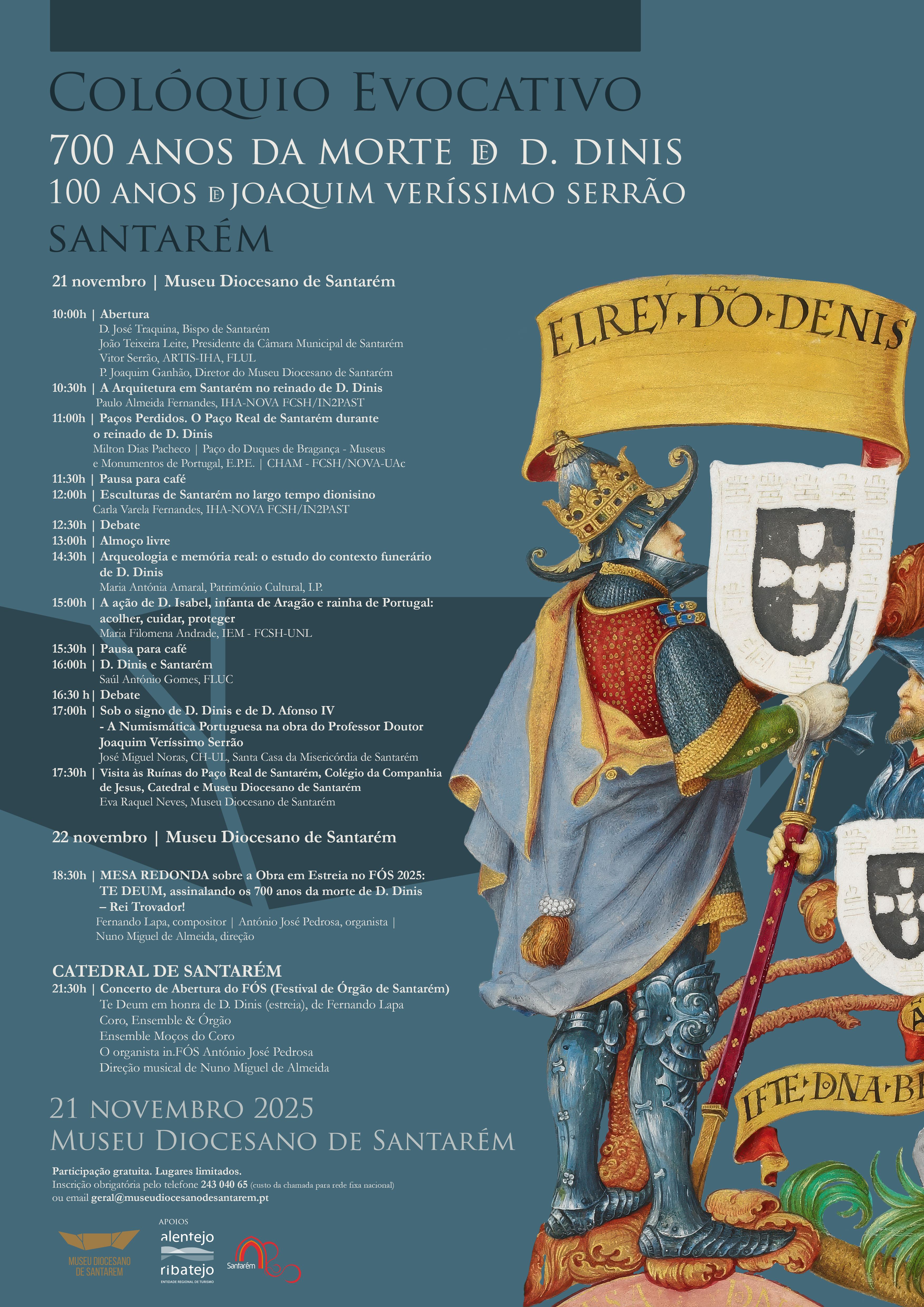 O Museu Diocesano de Santarém promove, no próximo dia 21 de novembro de 2025, um Colóquio evocativo dos 700 anos da morte do Rei D. Dinis, nos 100 anos do nascimento de Joaquim Veríssimo Serrão.